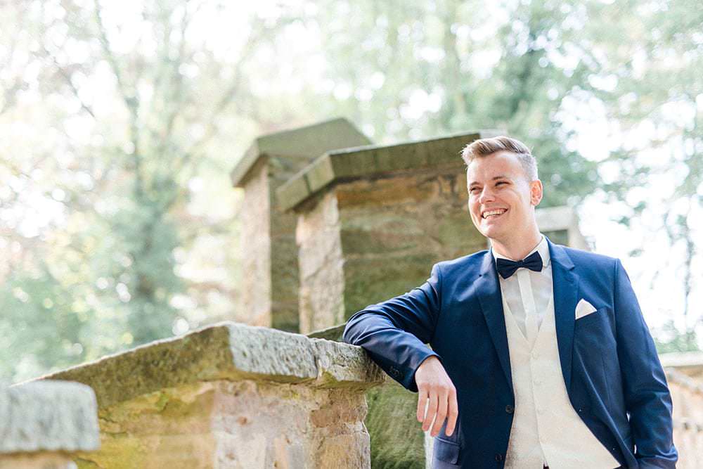 Ich traf mich mit dem Brautpaar auf Schloss Gravensburg. Das Schloss liegt in der Nähe von Fritzlar und wartet mit einem sagenhaften Ambiente auf die Paare. Nachdem ich mein Equipment zusammen hatte, kam auch schon Sven. Kurzerhand beschlossen wir einfach schon mal ein kleines Shooting zu machen, wenn wir schon warten müssen, dann sind wir wenigstens produktiv. Im Nachhinein musste ich feststellen, dass ich sehr selten ein extra Bräutigamshooting gemacht habe. Normal trifft das eher auf die Bräute zu!