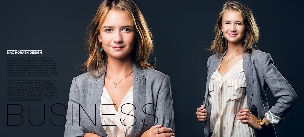 Im Studio lassen sich durch unterschiedliche Hintergründe auch sehr abwechlungsreiche Aufnahmen kreieren. Der typische Hintergrund bei Bewerbungsfotos ist ein dunkel grauer Karton. Das untere Bild ist ein Beispiel für diesen Karton, in diesem Fall habe ich aus zwei Fotos eine Collage erstellt, ohne Ränder und ohne Abtrennung in Form eines Strichs.